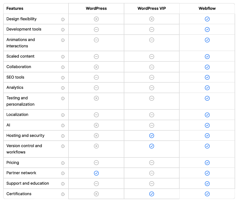 This comparison chart is from Webflow, so it's naturally favourable, but we agree with its points.